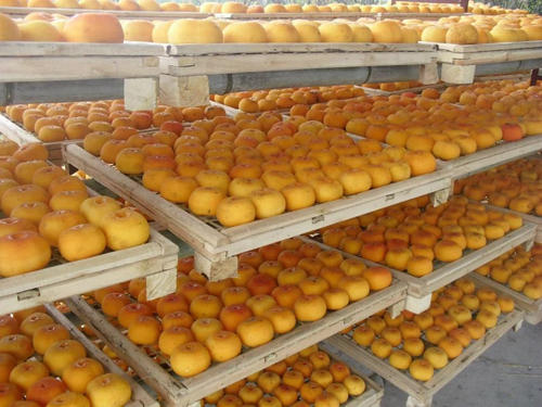柿饼在选果过后进行削皮处理,摆放在烘干盘上就可以推进烘干房了,烘烤时炉温高低影响柿果干燥的速度和品质。应按低→高→低进行变温间隙性烘烤。即初期炉温控制在40℃左右,待果实脱涩软化后,将炉温升至50 ℃左右,使水分迅速蒸发,果实失水至49.99%,降温至40℃直至烘成。烘成的柿饼标准是,内外软硬一致,果肉富于弹性,失水率65%-70% 。前期炉温不能过高,否则酒精脱氢酶的活动受到抑制,可溶性单宁不沉淀,烤成的柿饼仍有涩味;后期温度也不能太高,太高时柿饼出现“硬壳”。烘烤全过程中,温度不得低于30℃,否则容易长霉或发酵 ;也不能超过70℃,否则柿果蒸熟,呈黄褐色,果面渗出胶状物,风味不佳。烘烤过程也要注意通风换气,一半情况空气能烘干机会自带这个功能,烘干房内必须通风良好。通风不良时,烘干房内湿气不能排出,很容易发霉、发酵。所以现在大部分果蔬烘干房都是用的循环风,所以这点也不需要担心,如果是别的烘干方法的话就另当别论了。